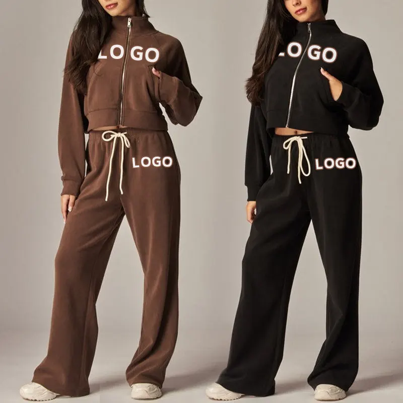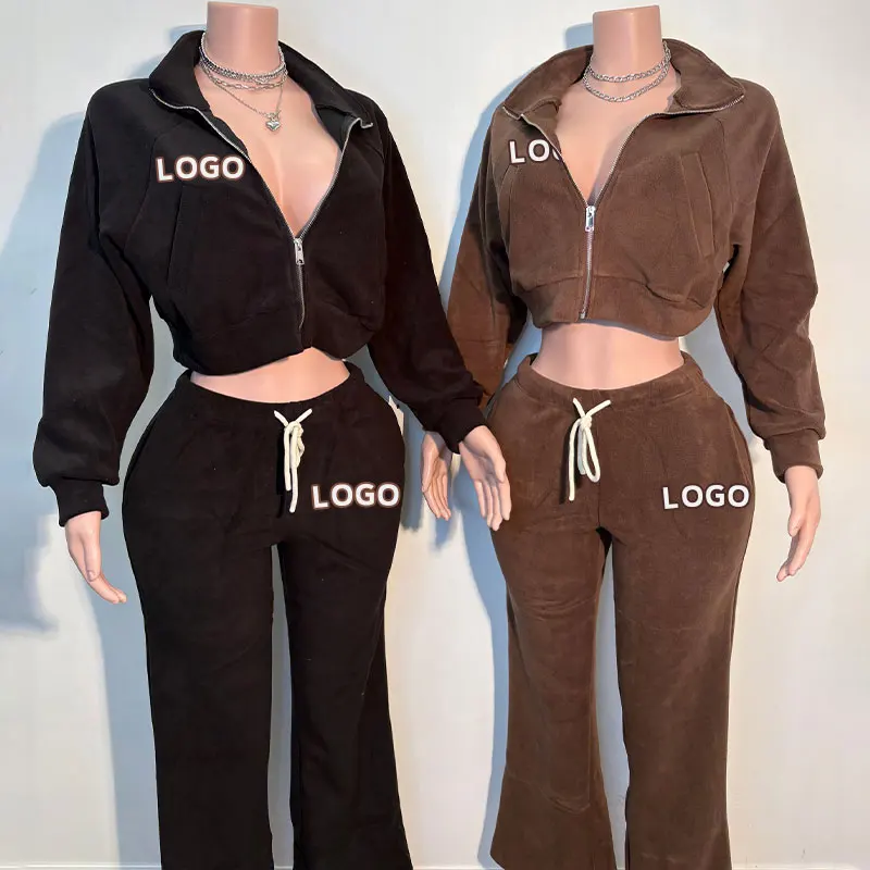 Huili New Arrival Suede Solid Color Wide Leg Pants & Zipper Jacket 2 Piece Zip up Crop Top Outfits Women's Loungewear Sets
